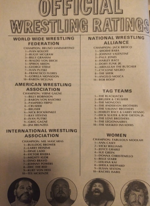 First, we arrive at the rankings page. There are several noteworthy points to consider here. Ivan Koloff is ranked as the #1 contender in the WWWF. This was a few years after he took the title from Bruno and shocked the world. Bugsy McGraw is ranked number 2, which seems odd to me. I don't know what Bugsy was doing in the mid-70s, but when I was a kid in the 80s, he was using a comedy gimmick of being a goof and was never any threat to anyone's title. Larry Heinime is ranked number 2 in the IWA rankings. A lot of fans may remember him best as one of the original Andersons - Lars. He wrestled as Lars Anderson previously to this publication and afterward, as well, so I'm not sure why he went by his birth name while wrestling in the IWA, but it's interesting to see.