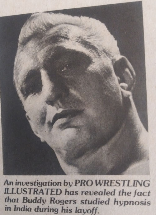 Next, let's take a look at Stu Saks' "Dressing Room Confidential" column, where he explains what Buddy Rogers has been doing during his 15-year layoff from being a former world champion until coming back to become a manager. Apparently, Rogers spent (kayfabe) years in India studying hypnosis to make the wrestlers he manages more "animalistic"! You gotta love these old wrestling magazines and the shit they came up with.