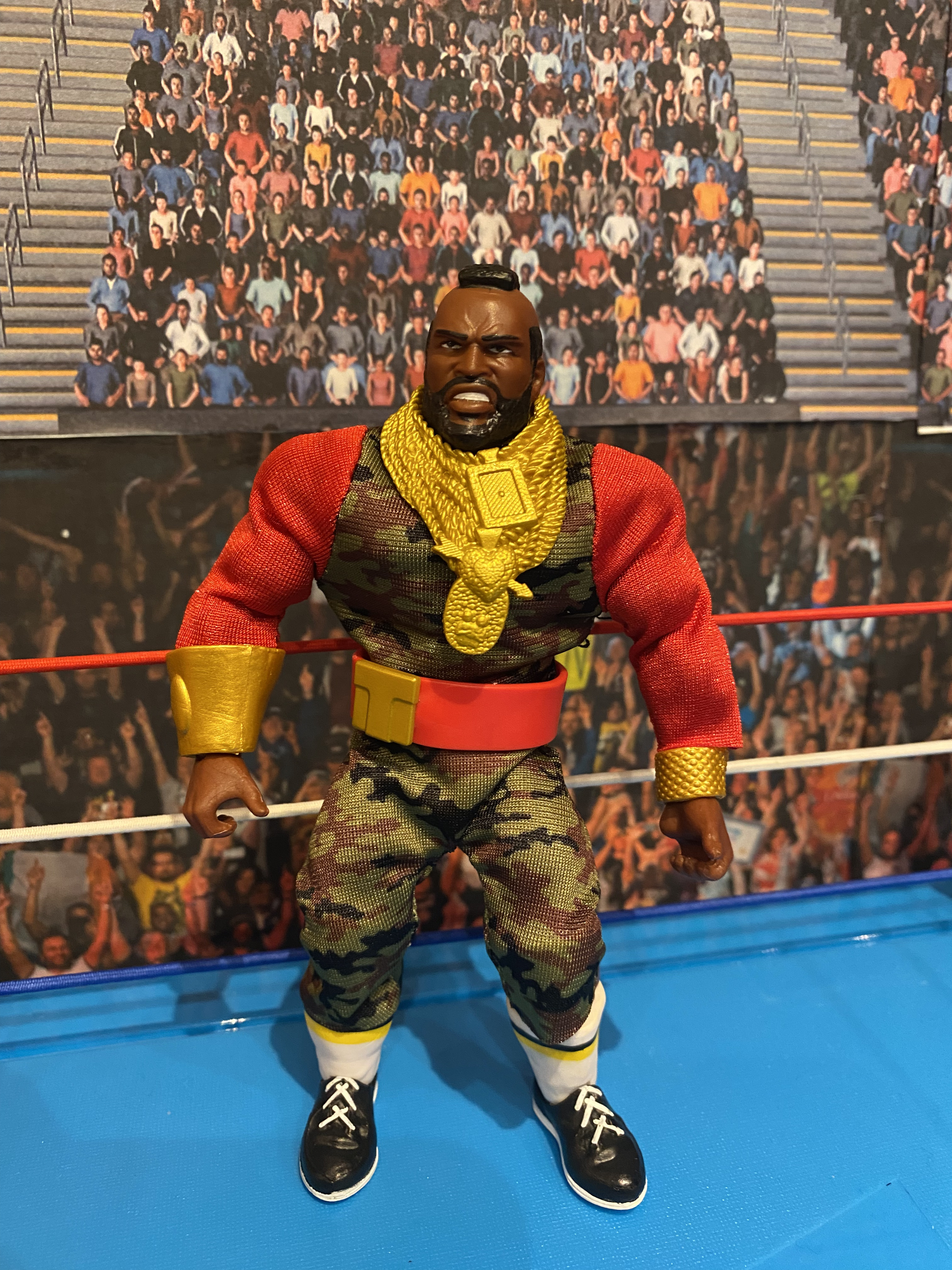 We kick things off with Mr. T and, while we have a ton of Mr. T figures under the Mattel license (include a Masters of the WWE Universe one), there's enough here to make this figure stand out. The WWE Hall of Famer is decked out in camo gear with a red shirt underneath (reminiscent of his stint on The A-Team), with gold chains and bracelets included.